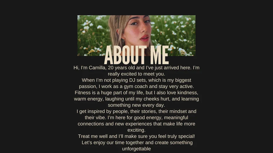 Avaliação de pintos, Ahegao, Cosplay, Salto alto, Massagem, Brinquedos para mamilos, Show com óleo, Chuveiro, Rebolando, Ioga, De quatro, Exibicionismo, Cozinha, Fetiche por pés, Posição 69, Dança erótica, Get Naked, Free Lovense Control, Topless, Linguagem explícita, Dildo ou vibrador, Boquete, Penetração com dedos, Masturbação, Orgasmo, Tapas, Brinquedos sexuais, Atuação, Cavalgada, Anal